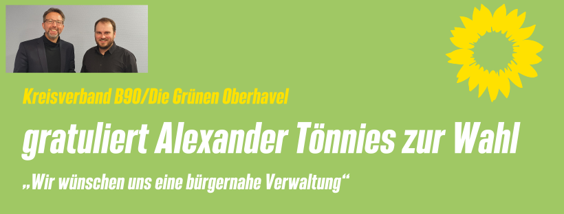 Der Kreisverband Bündnis 90/Die Grünen Oberhavel gratulierte Alexander Tönnies zur Wahl zum Landrat. Ingrid Hüchtker, Sprecherin des Kreisverbandes, erklärte am Mittwoch nach der Bekanntgabe des Wahlergebnisses im Kreistag:
