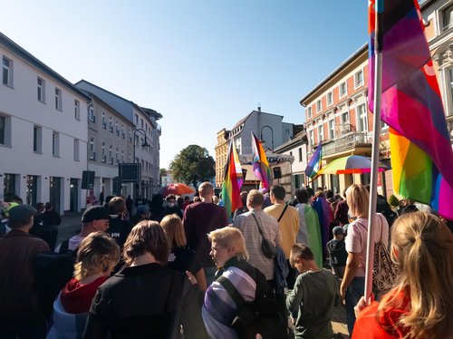 Am Samstag, den 27. September, um 13 Uhr startete die CSD-Demo am Bahnhof von Oranienburg. Es ging darum, gemeinsam ein Zeichen zu setzen für die Rechte und die Sichtbarkeit von Queers. Darum, uns als Menschen zu feiern, für unsere Diversität. Das ist in Zeiten, in denen Toleranz und Gleichberechtigung durch rechte Narrative leiden, umso wichtiger.