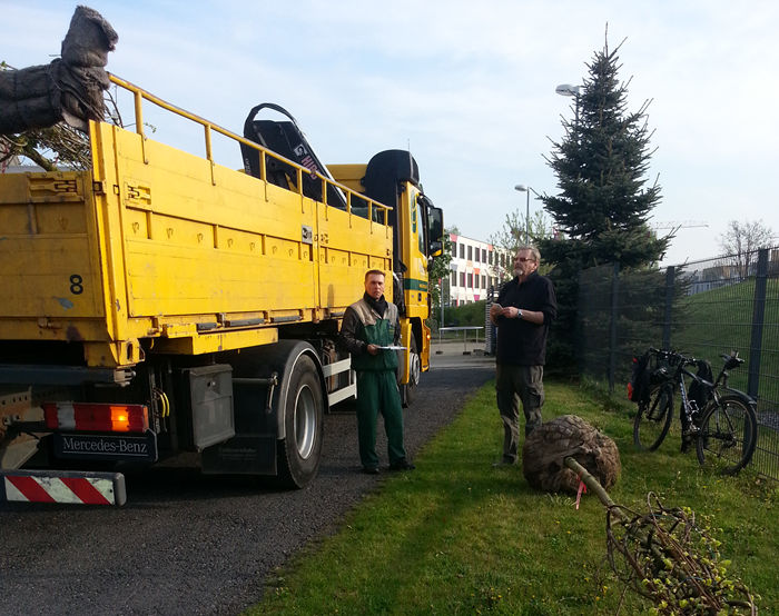 Am Vormittag hatte die Glienicker Bürgerinitiative Baumschutz (BiB) zusammen mit der Gemeinde bereits einen Apfelbaum in der Kita Burattino gepflanzt. Nun waren zahlreiche Mitglieder der Bürgerinitiative in die Lindenstraße gekommen und verfolgten gespannt, wie die Linde an ihren endgültigen Standort kam.
