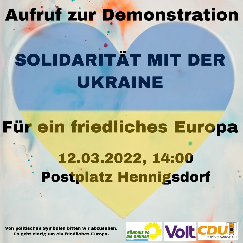Bündnis 90/Die Grünen Oberhavel, Volt Deutschland und der CDU Stadtverband Velten rufen gemeinsam zur Demonstration für ein friedliches Europa und die Solidarität mit der Ukraine auf.