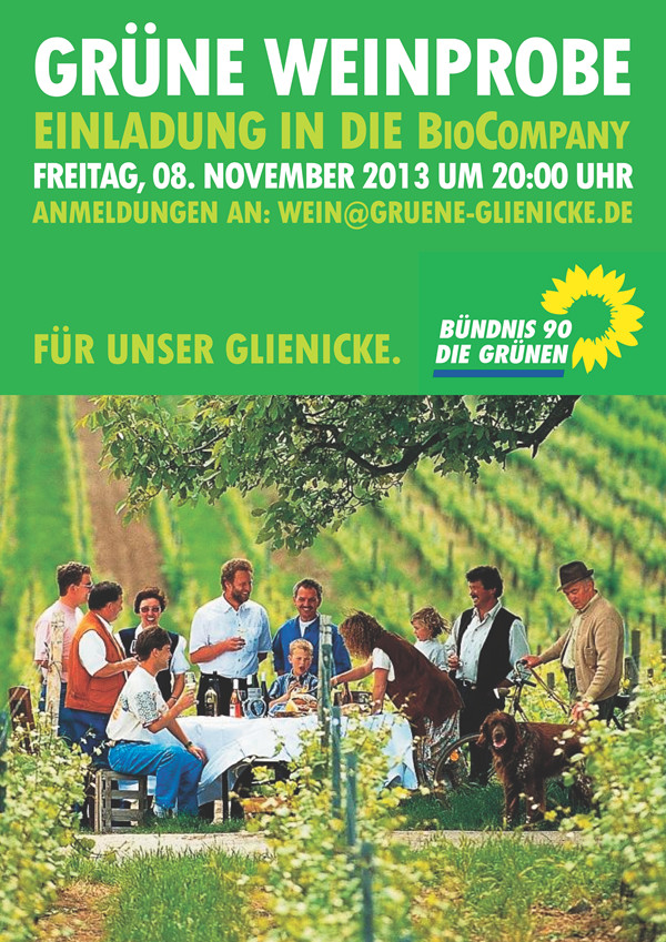 Nun wollen die Glienicker GRÜNEN aus der Veranstaltung eine Tradition erwachsen lassen. An Ort und Wein interessierte Glienicker Bürgerinnen und Bürger sind herzlich eingeladen, am Freitag, den 08. November ab 20:00 Uhr in der BioCompany einen zwanglosen, unterhaltsamen Abend zu genießen. Da die Plätze begrenzt sind, bitten wir Sie, sich bei Karsten Wundermann anzumelden (Karsten.Wundermann@Gruene-Glienicke.de).