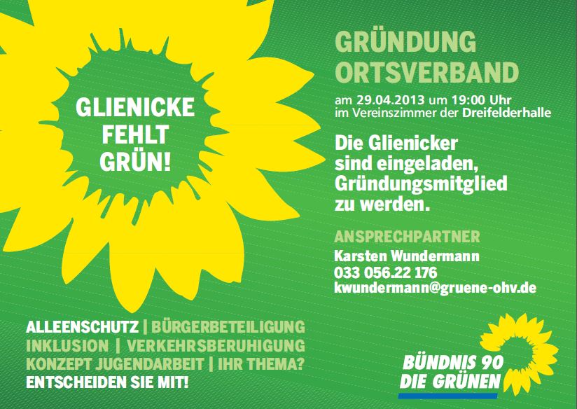 Es wird auch Glienicke gut tun, eine Grünen-Vertretung im Rathaus zu haben. Gestalten Sie die Ortspolitik mit, bringen Sie ihr Anliegen auf die Agenda. Seien Sie am 29. April um 19:00 Uhr dabei, wenn im Vereinszimmer der Dreifelderhalle der Ortsverband der Grünen gegründet wird.