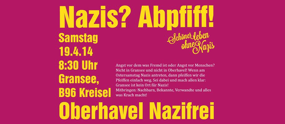 Am Samstag, den 19.04.2014 möchte die NPD in Gransee eine Hetzveranstaltung unter dem Titel "Asylflut stoppen" durchführen. Ab 8:30 Uhr ist am zentralen Kreisverkehr Templiner Ecke Strelitzer Str eine Gegenkundgebung angemeldet. Da mit einer solchen Kundgebung wohl auch bald in anderen Orten Oberhavels zu rechnen ist, wäre es toll wenn wir die Gelegenheit nutzen, um von Anfang an in Oberhavel gemeinsam vorzugehen. Wer Lust hat den Osterspaziergang etwas vorzuziehen, ist in Gransee sehr willkommen. Gewünscht ist ein friedliches Pfeifkonzert, um lautstark klar zu machen, dass Nazis hier nichts zu melden haben. Wer teilnehmen möchte, kommt am besten um 8:00 zum Bahnhof Oranienburg. Wir nehmen dann den Zug um 8:10 Uhr.