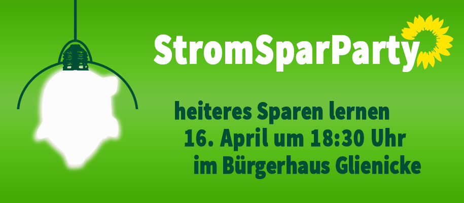 Welche Möglichkeiten gibt es in Glienicke? Am 10.4.2014 um 18:30 Uhr können Sie an einer privaten StromSparParty teilnehmen. Begrenzte Teilnehmerzahl, baldige Anmeldung empfohlen. Wenn Sie selber eine Party bei sich zu Hause veranstalten möchten, helfen wir Ihnen bei der Organisation. Bitte nehmen Sie mit uns Kontakt auf.