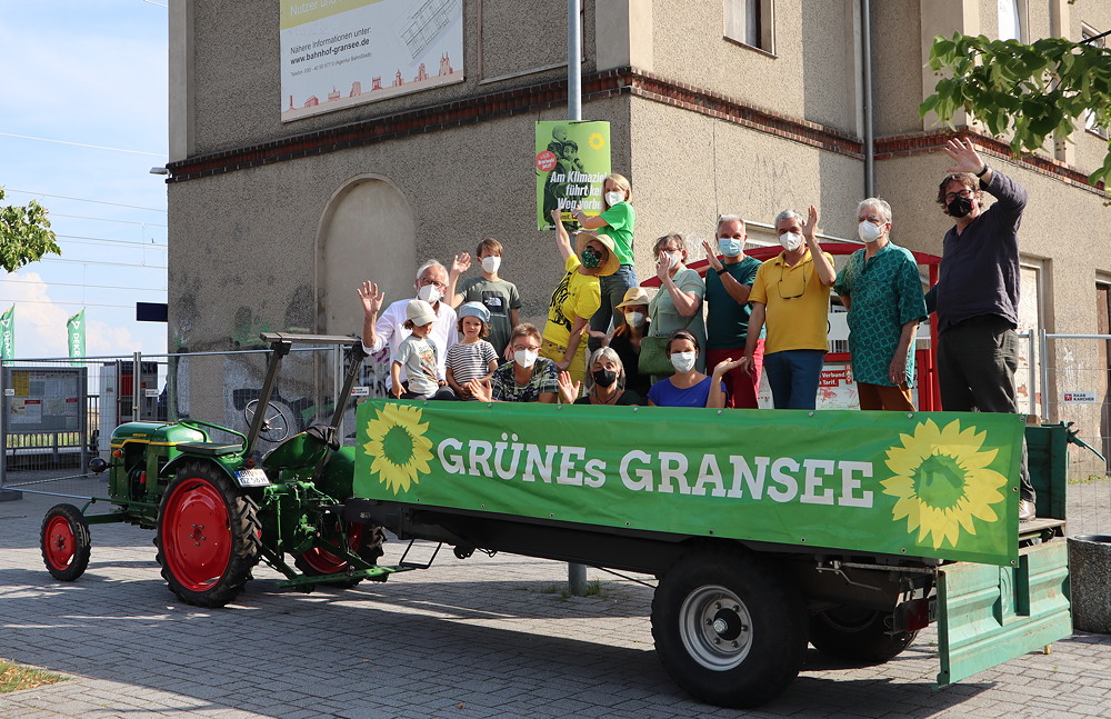 Der Ortsverband Gransee von Bündnis 90/Die Grünen startete am Montag mit einer Tour unter dem Motto „Jetzt geht’s los“ auf einem Oldtimer-Trecker in den Wahlkampf. Am Bahnhof Gransee hängte die Gruppe der Aktiven das allererste Wahlplakat auf mit dem Motto „Am Klimaziel führt kein Weg vorbei“. „Wie können wir einen klimagerechten Wohlstand schaffen? – das ist natürlich eine Leitfrage dieser Bundestagswahl“, erklärte Ingrid Hüchtker, Sprecherin des Ortsverbandes, „Aber auch die anderen Themen wie soziale Sicherung oder Digitalisierung oder Kinderrechte werden wir mit den Plakaten, die wir in unserer Region aufhängen wollen, ansprechen.“ Hüchtker weiter: „Wir hoffen, dass die Plakate viele Bürgerinnen und Bürger anregen zur Wahl zu gehen. Denn das sind wir alle unserer Demokratie schuldig. Nur wer sich einmischt, kann auch verändern.“