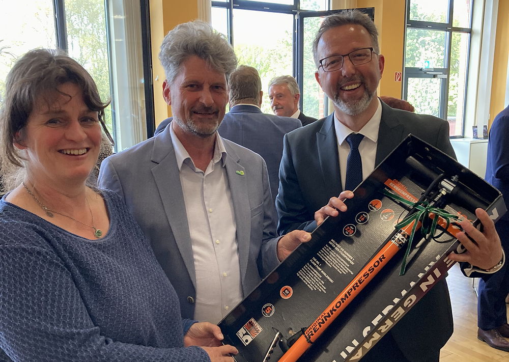Am vergangen Mittwoch hat der neue Landrat Alexander Tönnies seinen Amtseid abgelegt. Als kleines Präsent des Kreisverbandes wurde eine hochwertige Fahrradpumpe überreicht. So wird der neue Landrat hoffentlich für die Belange der Fahrradfahrer ordentlich Druck machen.