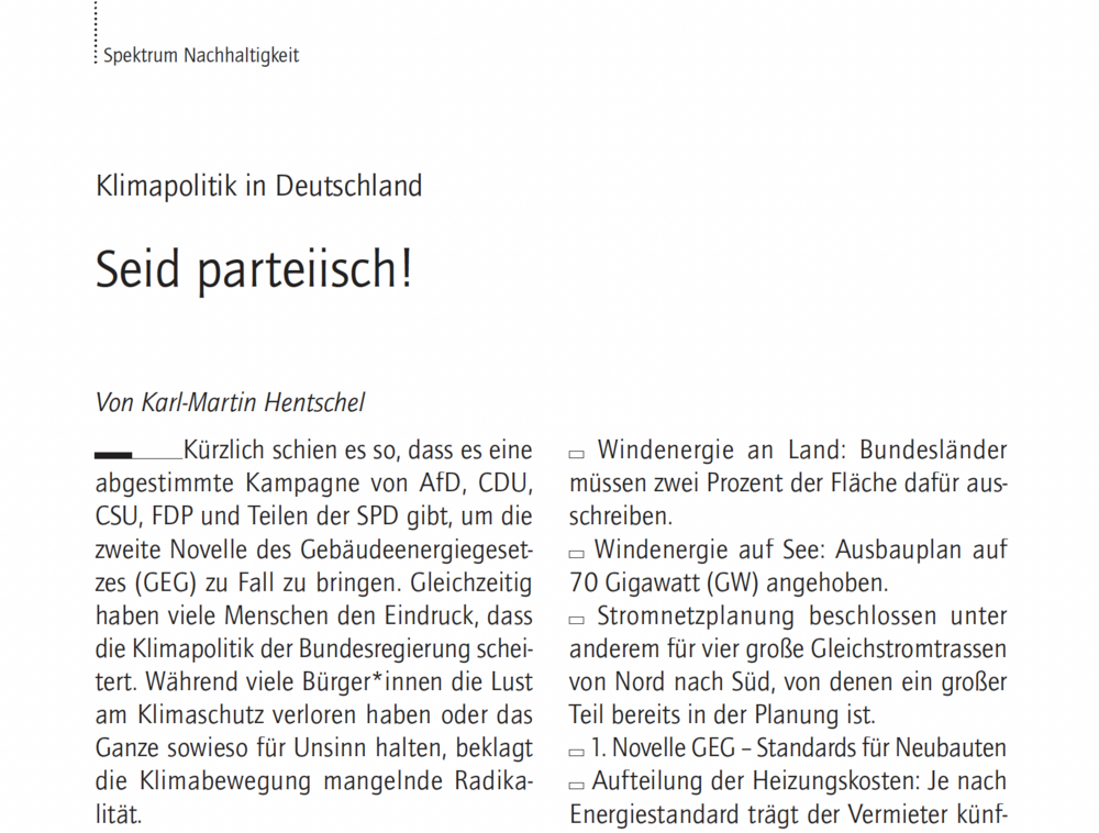 Kürzlich schien es so, dass es eine abgestimmte Kampagne von AfD, CDU, CSU, FDP und Teilen der SPD gibt, um die zweite Novelle des Gebäudeenergiegesetzes (GEG) zu Fall zu bringen. Gleichzeitig haben viele Menschen den Eindruck, dass die Klimapolitik der Bundesregierung scheitert. Während viele Bürger*innen die Lust am Klimaschutz verloren haben oder das Ganze sowieso für Unsinn halten, beklagt die Klimabewegung mangelnde Radikalität.