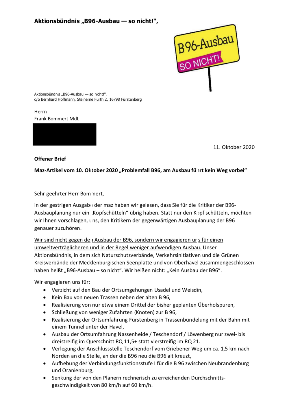 in der gestrigen Ausgabe der maz haben wir gelesen, dass Sie für die Kritiker der B96-Ausbauplanung nur ein „Kopfschütteln“ übrig haben. Statt nur den Kopf schütteln, möchten wir Ihnen vorschlagen, uns, den Kritikern der gegenwärtigen Ausbauplanung der B96 genauer zuzuhören. Wir sind nicht gegen den Ausbau der B96, sondern wir engagieren uns für einen umweltverträglicheren und in der Regel weniger aufwendigen Ausbau. Unser Aktionsbündnis, in dem sich Naturschutzverbände, Verkehrsinitiativen und die Grünen Kreisverbände der Mecklenburgischen Seenplatte und von Oberhavel zusammengeschlossen haben heißt „B96-Ausbau – so nicht“. Wir heißen nicht: „Kein Ausbau der B96“.