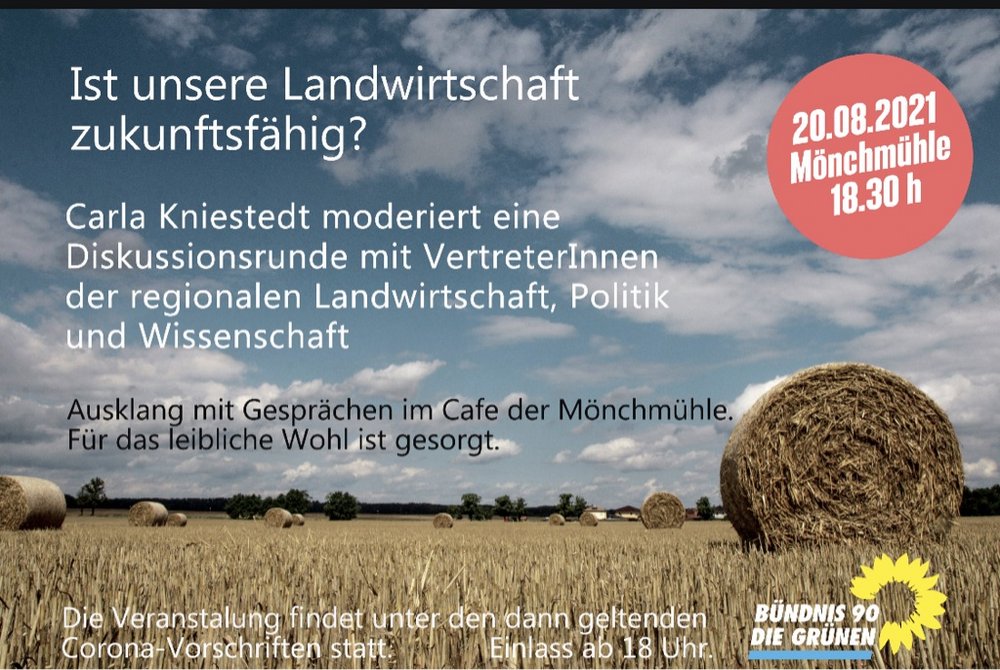 Herausgekommen dabei ist nun eine Diskussionsrunde am Freitag, dem 20.8. um 18.30 h mit vielen interessanten, kompetenten Gespächspartnern, wie Reiner Merker (Vorsitzender der Kreistagsfraktion B90/Die Grünen), regionale Landwirte, Dr. Katharina Reuter (Geschäftsführerin Bundesverband Nachhaltige Wirtschaft), Prof. Kaupenjohann (TU Berlin, Institut für Ökologie). Alle Zuschauer sollen die Möglichkeit haben, Fragen zu stellen und sich zu beteiligen. Für Gespräche vorher und nachher bereitet das Cafe in der Mönchmühle ein kleines Buffet mit landwirtschaftlichem Bezug und bietet Getränke an.