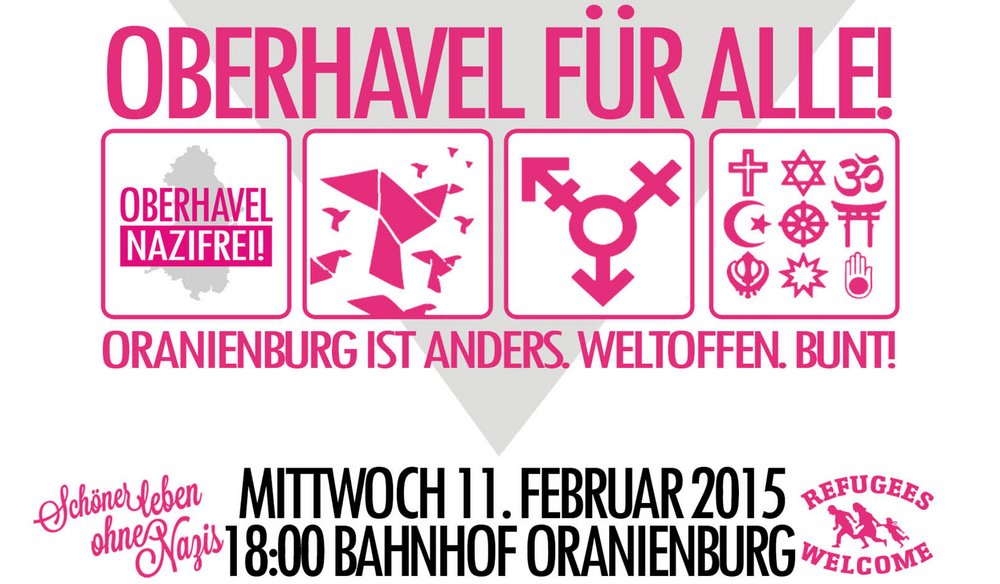 Wir erinnern uns an das, was war, nicht nur in den zwei Konzentrationslagern, deren schreckliche Geschichte unseren Landkreis noch heute prägt. Wir wissen, wohin die Ideologie der "Spaziergänger_innen" führen kann. In den 90iger Jahren mussten wir erleben, wie erst Häuser und dann Menschen brannten und wie die, die nur besorgte Bürger sein wollten, zu Täter_innen wurden. Auch deshalb: Statt #Pegida gilt, nicht nur bei uns, #niewieda! Wir werden es nicht zulassen, dass unser Landkreis erneut zum Austragungsort menschenverachtender Hetze wird. Oberhavel ist ein Ort für alle, egal welcher Herkunft, Religion oder sexuellen Orientierung.