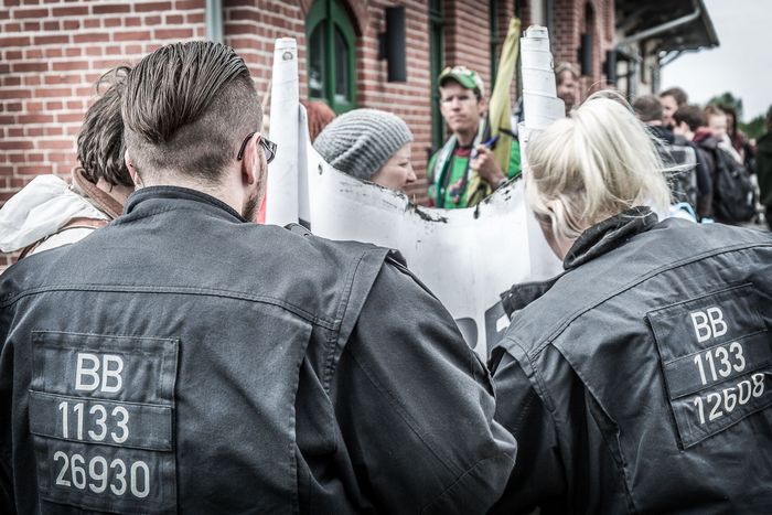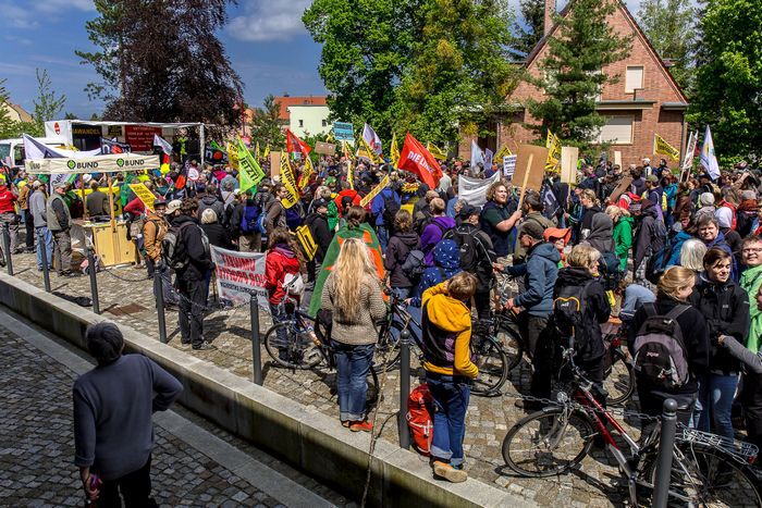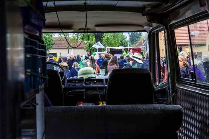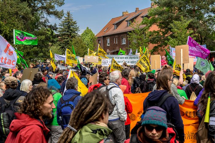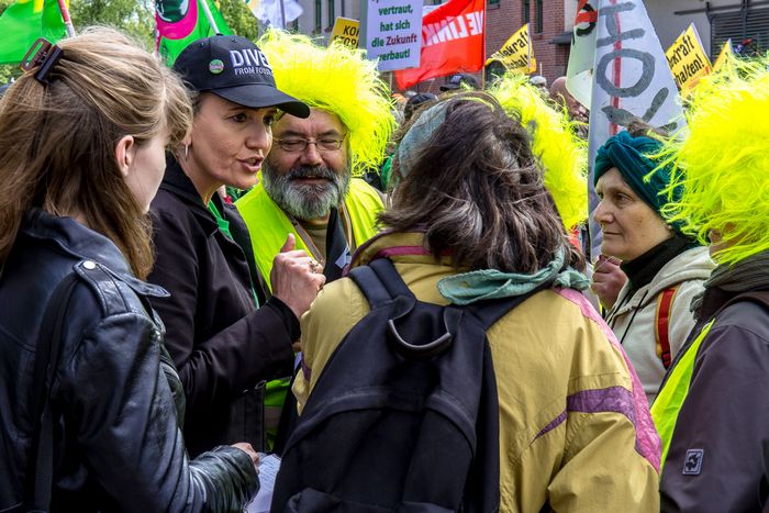 Unser Protest ist bunt, international und gewaltfrei. Wir freuen uns, dass trotz verschiedenster Versuche seitens der IGBCE uns zu provozieren, bisher alles friedlich und fröhlich verläuft. Wir nehmen es mit Humor und werden den Dialog weiter suchen.