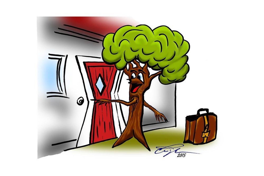 Es klingelt, ein junger Baum steht vor der Tür! Seine ausladende Krone in strahlendem Grün ist beeindruckend. Er hat einen Koffer dabei, hoffentlich will er nichts verkaufen. Er stellt sich vor: „Entschuldigung, dass ich störe, aber Ihr Vorgarten sieht so einladend aus. Ich suche ein neues Zuhause, zur Zeit wohne ich noch in einer Baumschule. Ich bin nach Glienicke gereist, hier gibt es wunderschöne Gärten und viele erwachsene Bäume, von denen ich noch lernen kann.