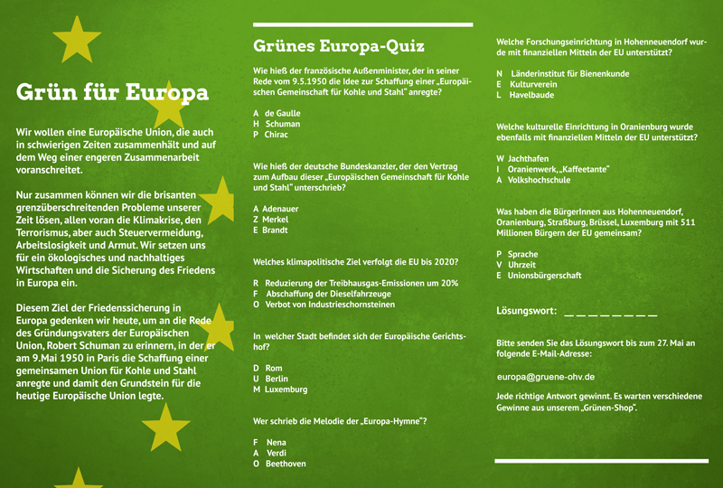 Mit dem Flyer soll aber nicht nur über die Verdienste die EU aufgeklärt werden: Man kann auch etwas gewinnen, wenn man ein paar Quizfragen zur Geschichte und Leistungen der EU richtig beantwortet. Denn wussten Sie, welche Forschungseinrichtung in Hohen-Neuendorf von der EU finanziell unterstützt wurde? Und welche kulturelle Einrichtung?