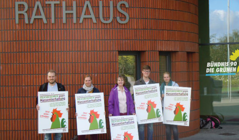Noch bis zum 14. Januar läuft das Volksbegehren gegen Massentierhaltung. Am Montag waren die Hennigsdorfer Grünen im Rathaus, um es zu unterschreiben. Dazu Petra Röthke-Habeck, Fraktionsvorsitzende in der SVV: "Immer mehr Menschen bewegt die Art und Weise, wie unsere Lebensmittel hergestellt werden. Das Volksbegehren soll dabei helfen, eine gesellschaftliche Debatte über die Zukunft der Landwirtschaft in Gang zu bringen." Die Hennigsdorfer Grünen erlebten, dass das Thema auch in Hennigsdorf diskutiert werde und rufen alle Hennigsdorferinnen und Hennigsdorfer auf, ins Rathaus zu gehen und ebenfalls zu unterschreiben. "In den kommenden Wochen werden wir zur Unterstützung des Volksbegehrens auch Plakatieren und Flyer verteilen. Diese Landesregierung braucht immer wieder den Druck der Volksgesetzgebung, damit sie sich bewegt", ergänzt Anja Senger, Sprecherin des Ortsverbandes. Das gelte auch für das zweite aktuell laufende Volksbegehren gegen eine dritte Startbahn am Flughafen BER. Zwar sei Hennigsdorf nicht direkt betroffen, dennoch sei es geboten, nicht noch in eine dritte unrentable und aus Klimaschutzgründen ebenfalsl abzulehnende Startbahn zu investieren.