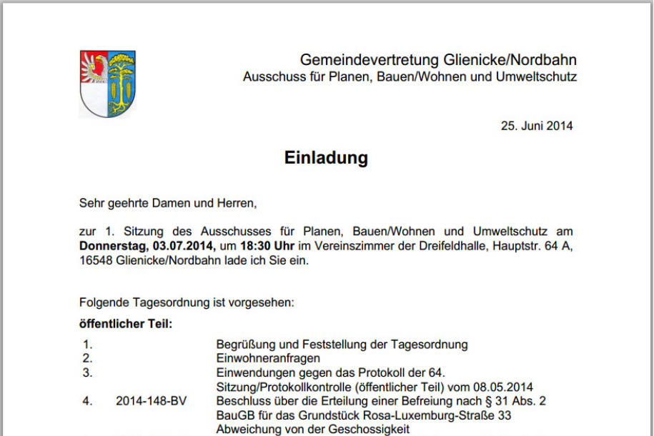 3. Juli 2014, erster Planungsausschuss der neuen Gemeindevertretung. Es ist 18:30 Uhr. Das Vereinszimmer ist voll besetzt. Ich stehe am Stirnende des "Erwachsenentisches" und versuche, Ruhe in die Menge zu bringen. Alle sind gespannt. Laut und deutlich ist wichtig: "Ich begrüße die Bürgerinnen und Bürger." Gleiches für die weiblichen und männlichen Sachkundigen Einwohner, die Gemeindevertreter und die Mitarbeiter der Verwaltung. Ich lese aus den Gesichtern: Wenn das so weiter geht, wird die nie fertig. "Diese Art der Begrüßung mache ich nur heute." Ich spüre Bedauern. War es eigentlich richtig, die Verwaltung zum Schluss zu nennen? Zwischenzeitlich platziert ein Bauherr, der seinen Antrag zur Befreiung vom Bebauungsplan erläutern will, ein Modell seines schicken Hauses in meiner Nähe auf dem Tisch. Ich setze mich. Die neben dem Modellhaus aufgestellten Baumattrappen nehmen mir die Sicht auf einige Teilnehmer.