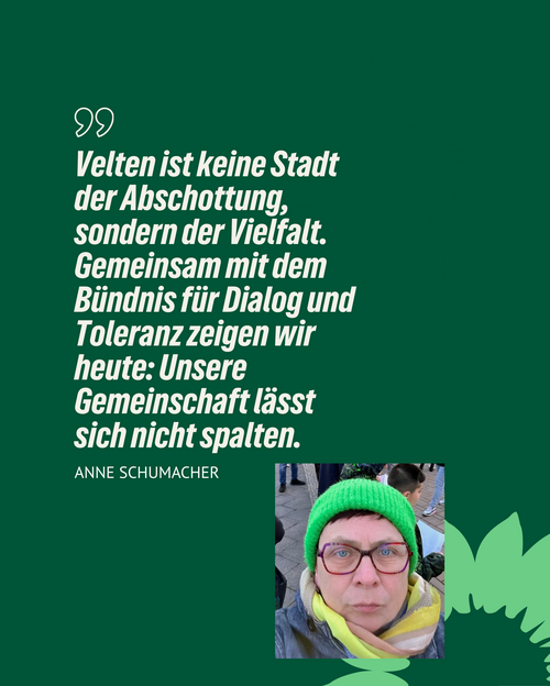 „Velten ist keine Stadt der Abschottung, sondern der Vielfalt. Gemeinsam mit dem Bündnis für Dialog und Toleranz zeigen wir heute: Unsere Gemeinschaft lässt sich nicht spalten“, so Anne Schumacher, Co-Sprecherin der Bündnisgrünen Oberhavel.