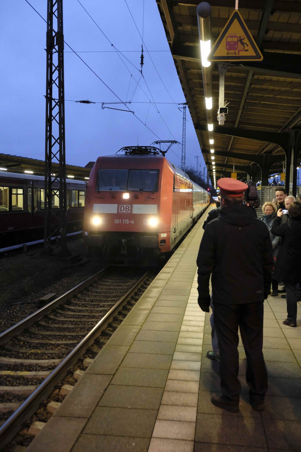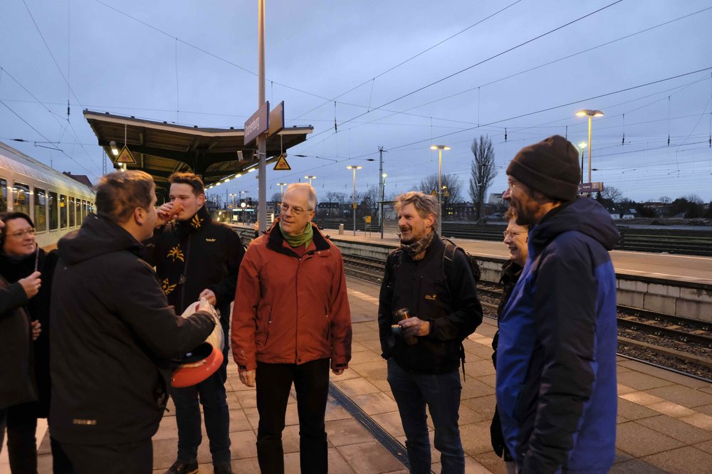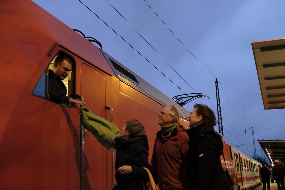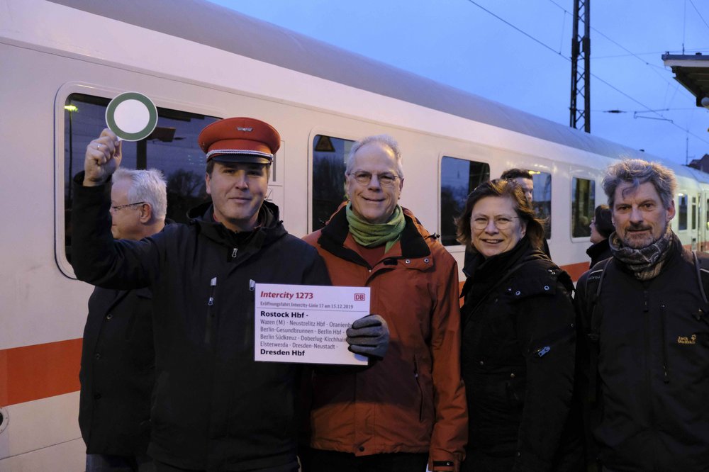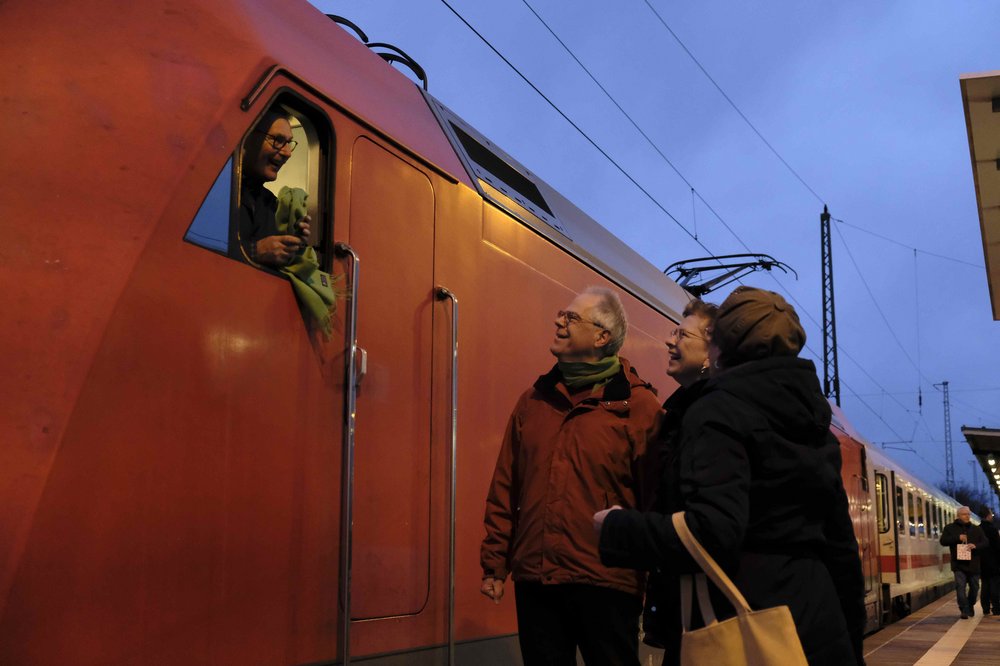 Eine Gruppe der Oberhaveler Bündnisgrünen begrüßte den ersten in Oranienburg haltenden Intercity von Rostock am Sonntagmorgen mit einem kleinen Jubel auf dem Bahnsteig und überreichte dem Zugpersonal einen Weihnachtsgruß als Dankeschön. Pünktlich um 7.54 Uhr rollte der Zug in den Oranienburger Bahnhof ein und setzte seine Fahrt nach kurzem Aufenthalt in Richtung Dresden fort.