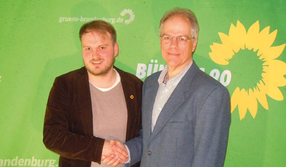 Landesvorsitzender BÜNDNIS 90/DIE GRÜNEN Clemens Rostock (links) gratuliert frisch gekürtem Bürgermeister-Kandidaten Heiner Klemp.