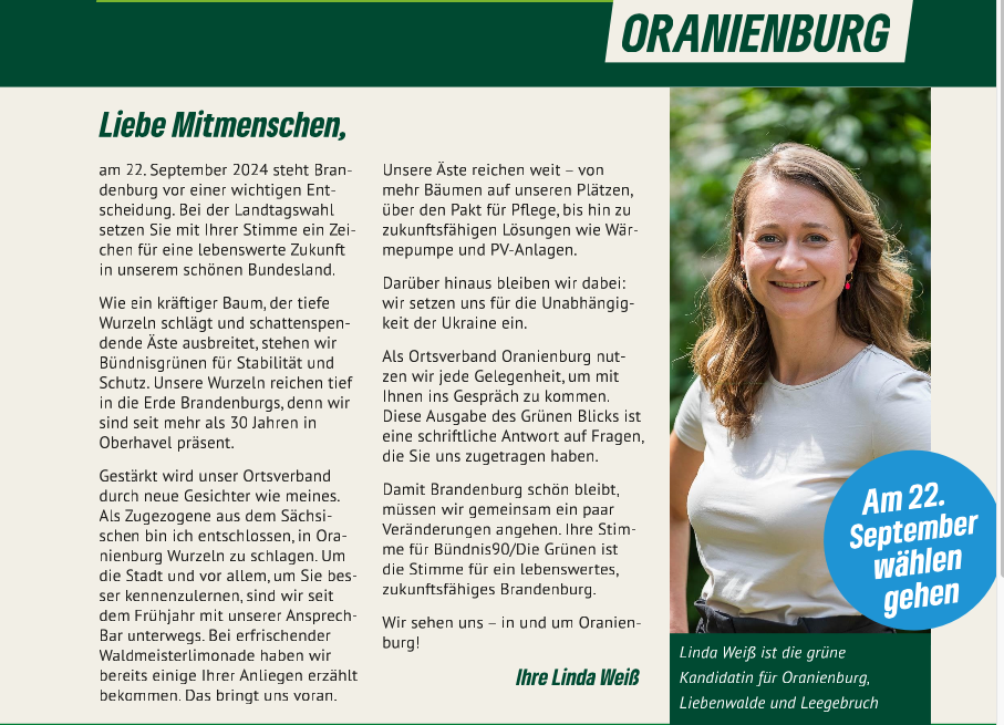 Der bündnisgrüne Stadtverband in Oranienburg veröffentlicht eine neue Ausgabe des Grünen Blicks. Dieses Mal werfen wir unser Augenmerk auf
