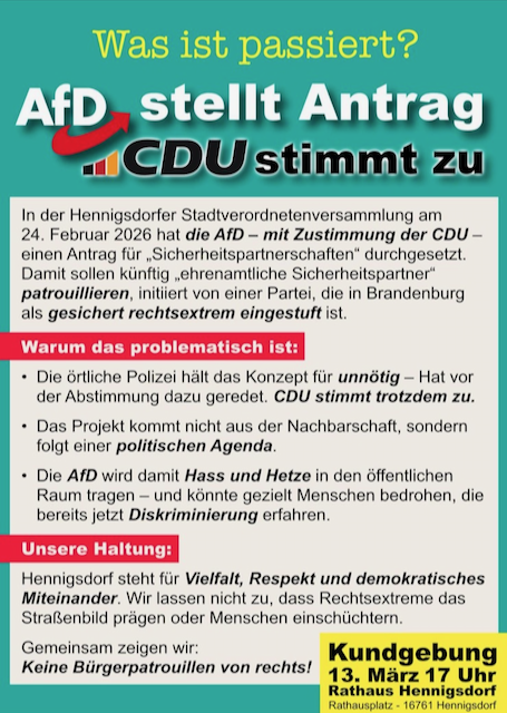 📢 Kundgebung: 13. März, 17 Uhr, Rathaus Hennigsdorf