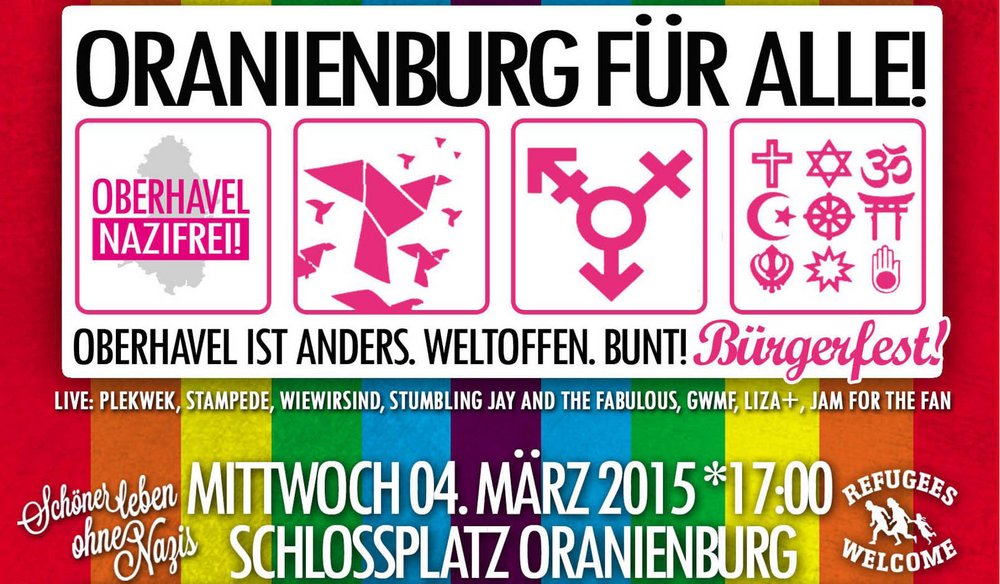 Bähm! Am nächsten Mittwoch gibt's was auf die Ohren! PlekWek, Stampede, WieWirSind, Stumbling Jay and the Fabulous, GWMF, Liza+ und Jam for the Fan könnt ihr beim Bürgerfest am Schloss ab 17 Uhr live erleben. Mit Ständen, Essen & Trinken und einem viefältigen Bühnenprogramm wollen wir ein Zeichen setzen für eine weltoffene Stadt! Oranienburg für alle - Refugees Welcome! Stehlen wir gemeinsam dem rechten "Abendspaziergang" die Show!