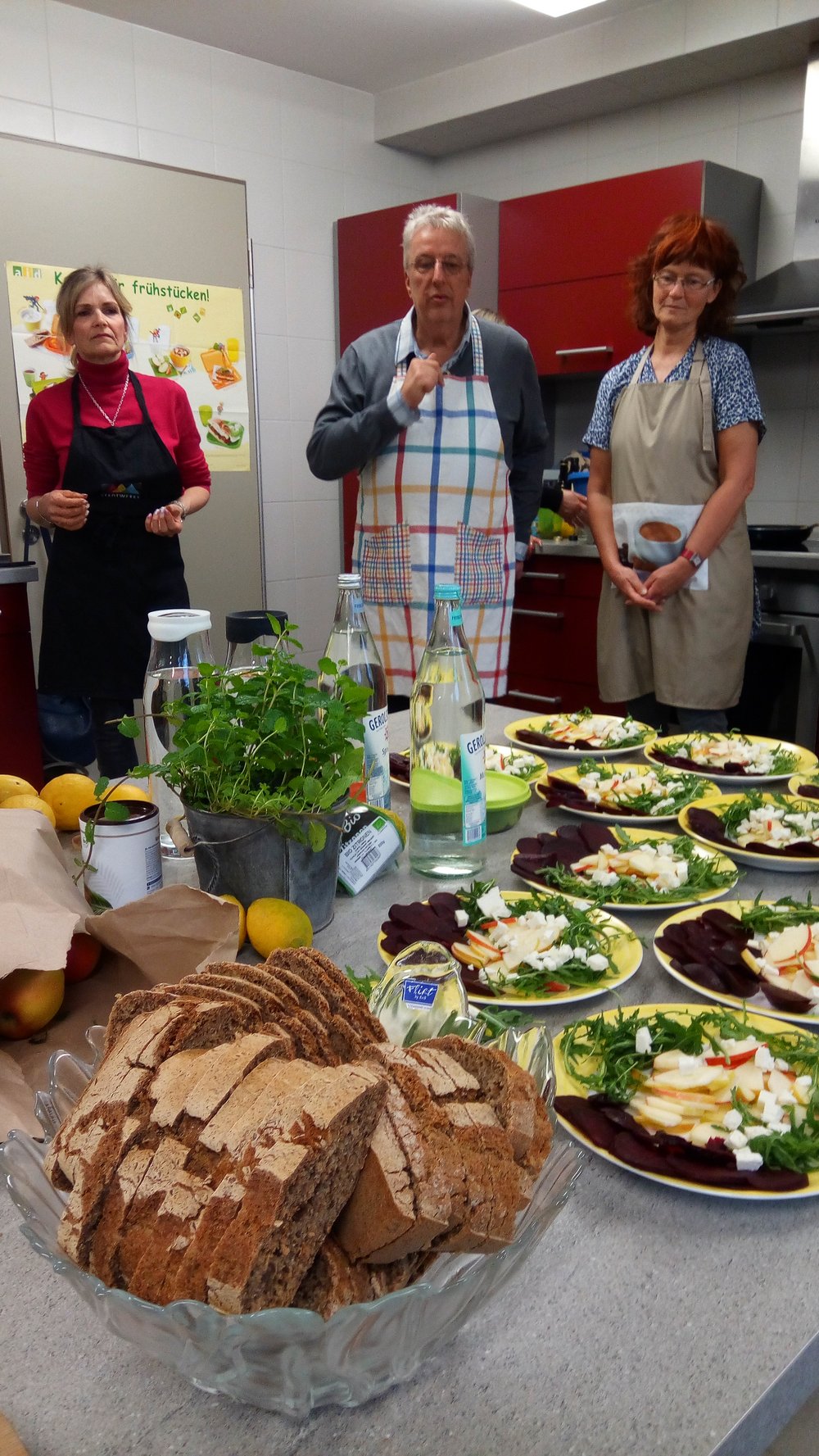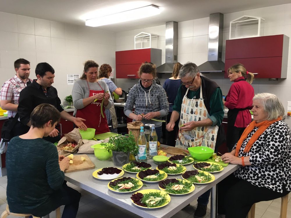 Dann wurden die Messer gezückt und in drei Gruppen die drei Gänge, allesamt aus saisonalen und regionalen Produkten zubereitet. Zum Start gab es eine Lauch-Kartoffel-Suppe, dazu selbstgebackenes Brot, gefolgt von einem Salat aus Rote Beete, Rucola, Äpfel, Feta und gerösteten Kürbiskernen. Zum süßen Abschluss ließen sich alle Rhabarber- oder Apfel-Crumble schmecken.