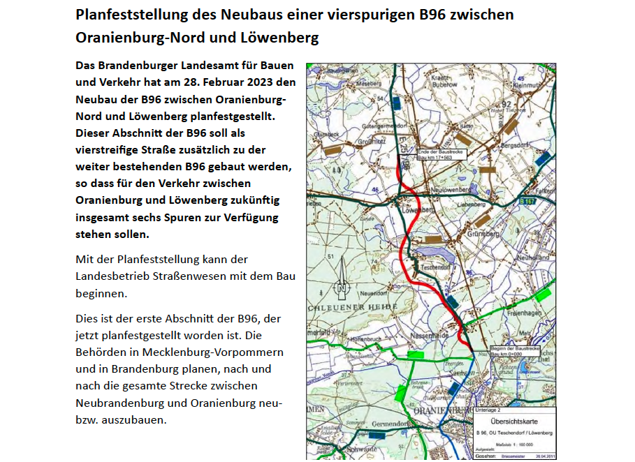 Das Brandenburger Landesamt für Bauen und Verkehr hat am 28. Februar 2023 den Neubau der B96 zwischen Oranienburg-Nord und Löwenberg planfestgestellt.