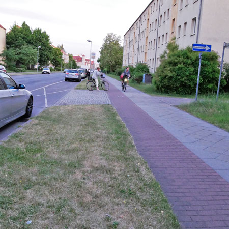 Viele Radfahrende fühlen sich auf separaten Radwegen wohler als auf der Straße. Jedoch geschehen vor allem dort die meisten Radunfälle, wo Radwege auf einmündende Straßen oder Einfahrten treffen – häufig mit tödlichem Ausgang. In Hennigsdorf, in Velten und Oranienburg mussten wir bereits Opfer auf Radwegen an Einmündungen beklagen. Die Unfallgefahr ist an diesen Stellen deswegen so hoch, weil Autofahrende die Radfahrenden aus dem Blick verlieren, wenn sie auf dem Radweg versteckt hinter parkenden Autos unterwegs sind. Auf der Fahrbahn geschützt durch 1,50 m breite Schutzstreifen sind Radfahrende am sichersten unterwegs. Dort bewegen sie sich stets im Blickfeld der Autofahrenden, die dadurch besser aufpassen und auf Radfahrende achten. Die Bundesanstalt für Straßenwesen hat ein Forschungsprojekt durchgeführt, wonach selbst die Radfahrstreifen schlechter abschneiden als die Schutzstreifen. Die Untersuchung kommt hinsichtlich der Schutzstreifen zu einer eindeutigen Aussage: „Die mittleren Unfallraten der Straßen mit Radwegen liegen mit 6,5 U/(1 Mio. RAD * km) höher als die der Radfahrstreifen mit 5,0 U/(1 Mio. RAD * km).