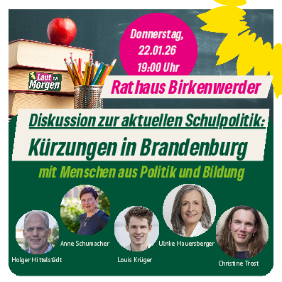 Mit einer Podiumsdiskussion zu aktuellen Fragen der Schulpolitik in Brandenburg möchten wir den öffentlichen Dialog stärken und zugleich die Initiative des Landeselternrats „Unterricht statt Ausfall – Verlässliche Bildungspolitik“ unterstützen.