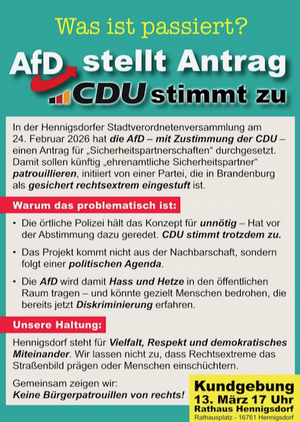 In der Hennigsdorfer Stadtverordnetenversammlung am 24. Februar hat die AfD mit Unterstützung der CDU einen Antrag zum Aufbau sogenannter „Sicherheitspartner-schaften“ durchgesetzt. Künftig sollen „ehrenamtliche Sicherheitspartner“ patrouillieren – initiiert von einer Partei, die in Brandenburg als gesichert rechtsextrem eingestuft ist.
